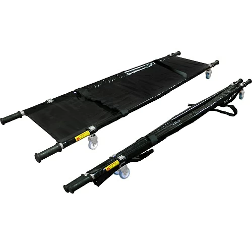 Носилки продольно складные НПС-ММ, на четырех колесах диаметром 75 мм, брусья изготовлены из легкого сплава, ложе из винилискожи. Складываются в продольном направлении.